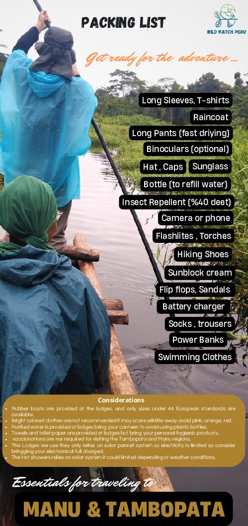 In this comprehensive guide, we’ve curated the ultimate packing list to ensure you’re well-prepared for every aspect of your journey. From essential clothing and gear to must-have accessories and safety items, our list covers everything you need to make your experience in the Peruvian jungle both comfortable and unforgettable. So, pack wisely and get ready to immerse yourself in the stunning biodiversity and breathtaking landscapes of Manu and Tambopata.