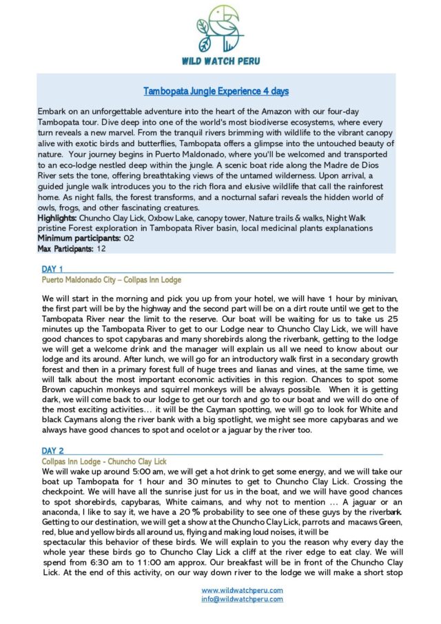 This immersive four-day journey ensures a perfect balance of adventure, relaxation, and cultural discovery. Whether you’re a passionate explorer or simply seeking a unique escape, Tambopata welcomes you—where the adventure of a lifetime begins.